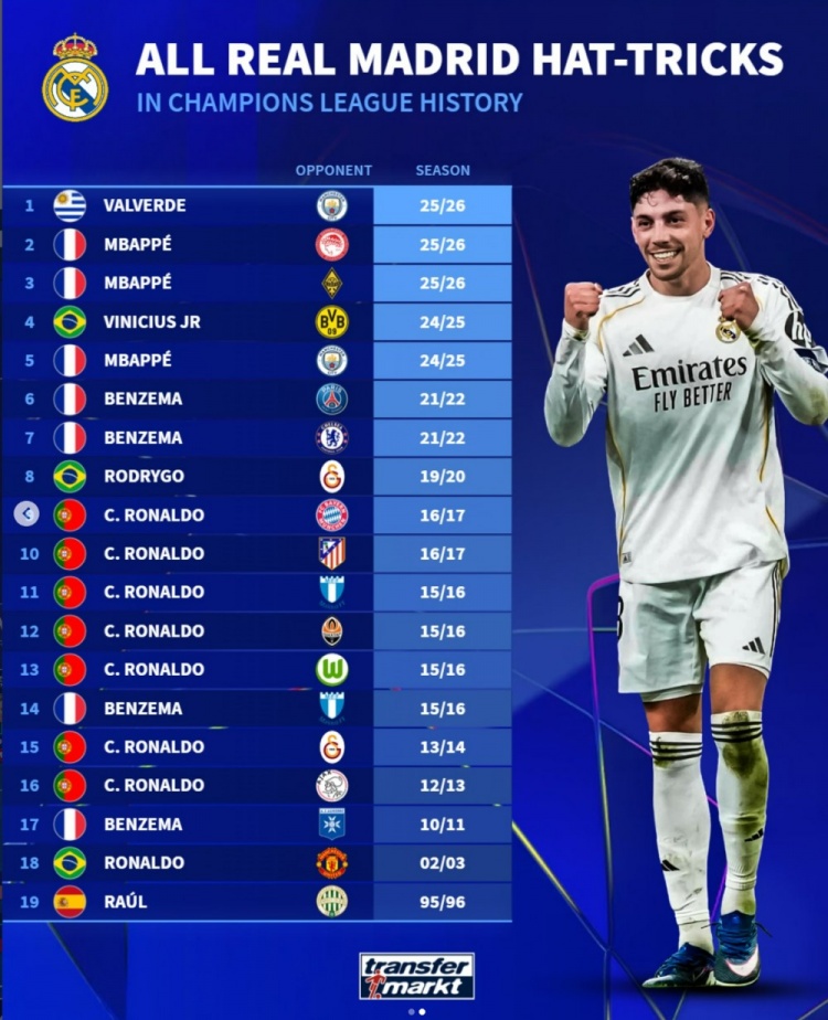 3月12日讯 在本轮欧冠皇马3-0击败曼城的比赛中,巴尔韦德上演帽子戏法,这也是皇马球员第19次在欧冠做到这一点。德转也盘点了皇马队史在欧冠生涯帽子戏法的情况: